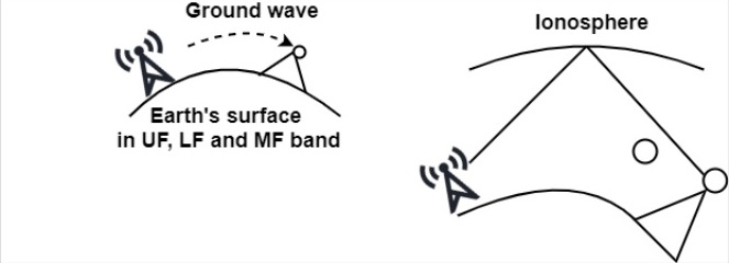 射頻可以透過空氣或空間傳播,但需要特定的發射和接收機制。它的頻率在 10 kHz 到 14 kHz 之間。在 VLF(超低頻)、LF(低頻)和 MF(中頻)波段,無線電波遵循地波。