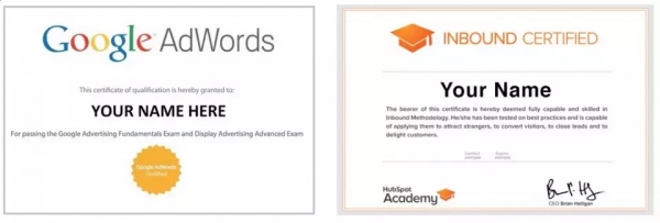 要將自己確立為數字營銷專家,獲得認證始終是最佳選擇。Google AdWords 認證和 HubSpot Inbound 認證是可以免費獲得的。即使您在最初的嘗試中沒有成功,也可以再次嘗試申請。