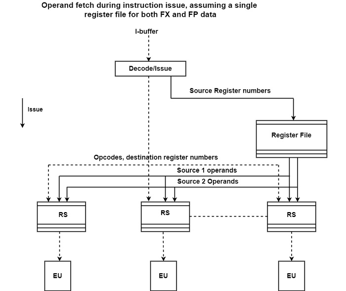 在這種情況下,在發出指令時,引用的源暫存器編號被轉發到暫存器檔案以獲取源運算元。它還可以將操作碼 (OC)、已發出指令的目標暫存器編號 (Rd) 和獲取的運算元值 (Op1 和 Op2) 寫入已分配的預留站。