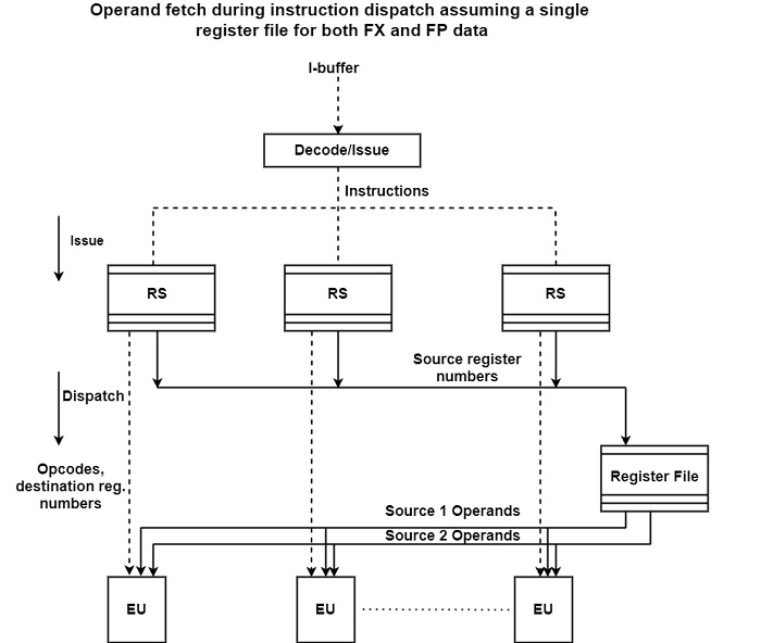 在排程期間,已排程指令的操作碼和目標暫存器識別符號從預留站傳遞到相關的執行單元 (EU),源暫存器識別符號被移動到暫存器檔案。然後,獲取源運算元並將其門控到等效 EU 的輸入端。