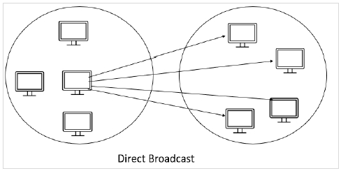 從源主機向不同網路中的所有其他主機傳輸資料,則稱為直接廣播。以下是直接廣播的示意圖: