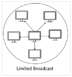 從一個源主機向同一網路中的所有其他主機傳輸資料稱為有限廣播。以下是有限廣播的示意圖: