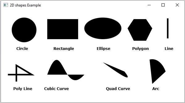 下面的 JavaFX 示例演示了所有可用二維形狀的建立: