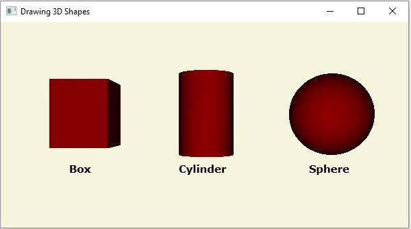 下面的 JavaFX 示例演示了所有可用 3D 形狀的建立。