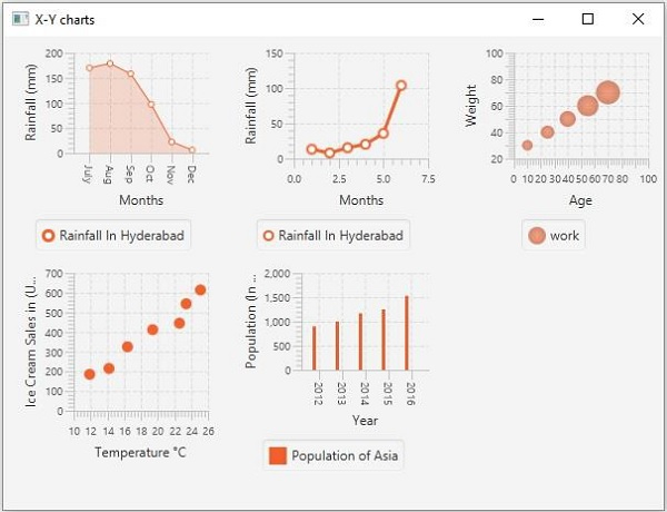 所有這些圖表都屬於 javafx.scene.chart 包。名為 Chart 的類是 JavaFX 中所有圖表的基類,而 XYChart 是所有在 XY 平面繪製的圖表的基類。