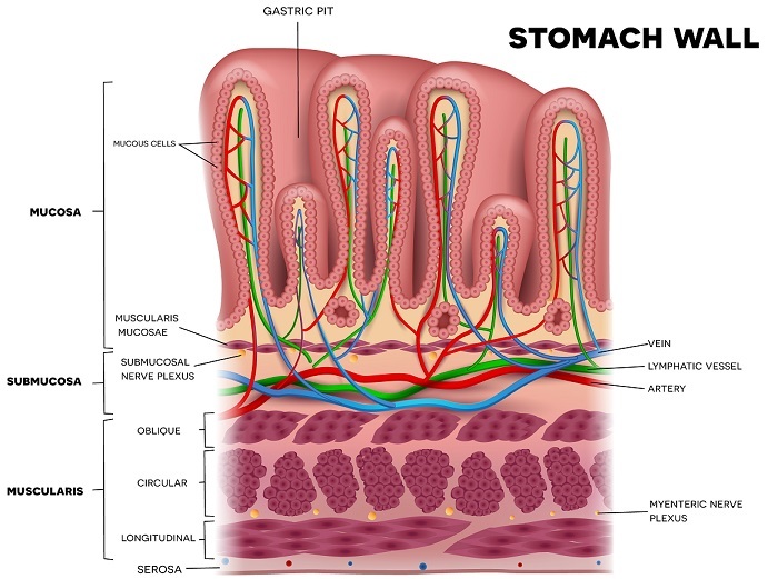 下一層是粘膜下層,這是一層厚的結締組織,包含為胃內壁提供血液、淋巴液和神經的血管和淋巴管。粘膜下層還包含專門的腺體,分泌粘液和其他物質,幫助保護胃內壁免受酸性環境的侵害。