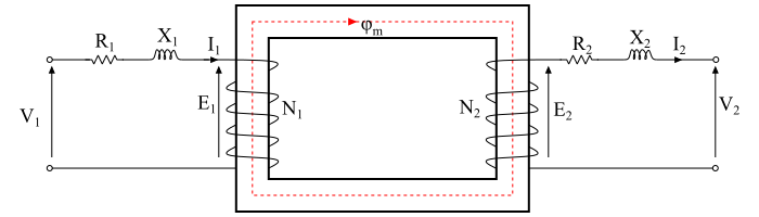 由於變壓器的繞組由銅導體組成,因此原邊和副邊繞組都將具有繞組電阻,這會在變壓器中產生銅損或I2R損耗。原邊繞組電阻R1和副邊繞組電阻R2分別與各自的繞組串聯(見圖)。