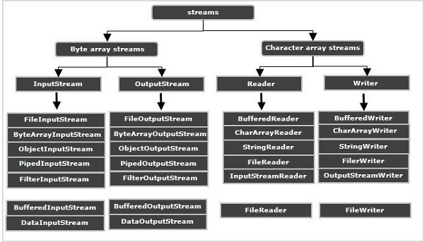 - 位元組流 − 這些流以位元組 (8 位) 處理資料,即位元組流類讀取/寫入 8 位資料。使用這些流可以儲存字元、影片、音訊、影像等。