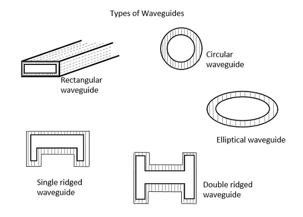 上面顯示的是波導的型別,它們在中心是空心的,由銅壁製成。它們在內表面有一層薄薄的 Au 或 Ag 塗層。