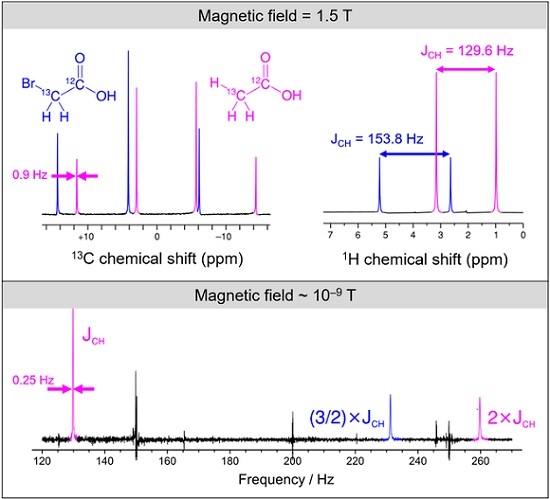 圖2:乙酸和溴乙酸的高場和零場核磁共振譜
