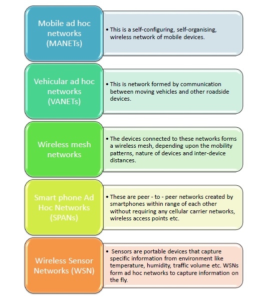 根據其應用程式的性質,臨時網路可以分為多種型別。以下圖表說明了最常見的臨時網路−