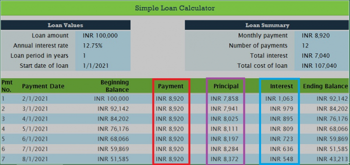 在下面的示例中,觀察分期付款金額如何在整個期限內保持固定,但貸款支付的本金和利息金額在每月之間如何變化。在還款的早期階段,利息部分最大。