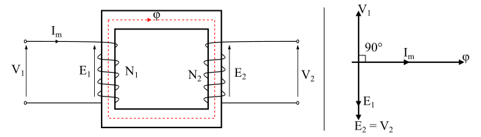 當將交流電壓V1施加到原邊繞組時,它會吸收非常小的勵磁電流Im來在磁芯中建立磁通,該磁通滯後於施加的電壓90°。勵磁電流Im產生與之成比例且同相位的交流磁通ϕm。此交流磁通(ϕm)透過磁場將原邊和副邊繞組連線起來,並在原邊繞組中感應電動勢E1,並在副邊繞組中感應電動勢E2。