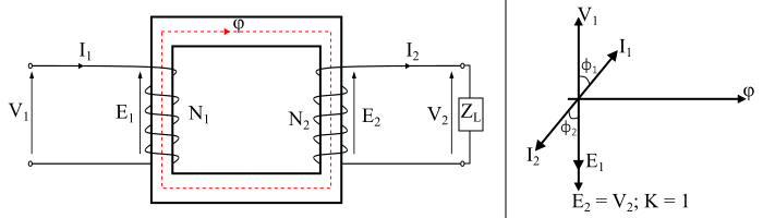在原邊繞組中感應的電動勢E1等於並與施加的電壓V1相反(根據楞次定律)。電動勢E1和E2滯後於磁通(ϕm)90°,儘管它們的大小取決於原邊和副邊繞組的匝數。從空載理想變壓器的相量圖可以看出,磁通對兩個繞組都是共有的,因此可以將其作為參考相量。此外,電動勢E1和E2彼此同相,但E1等於V1且與之反相180°。