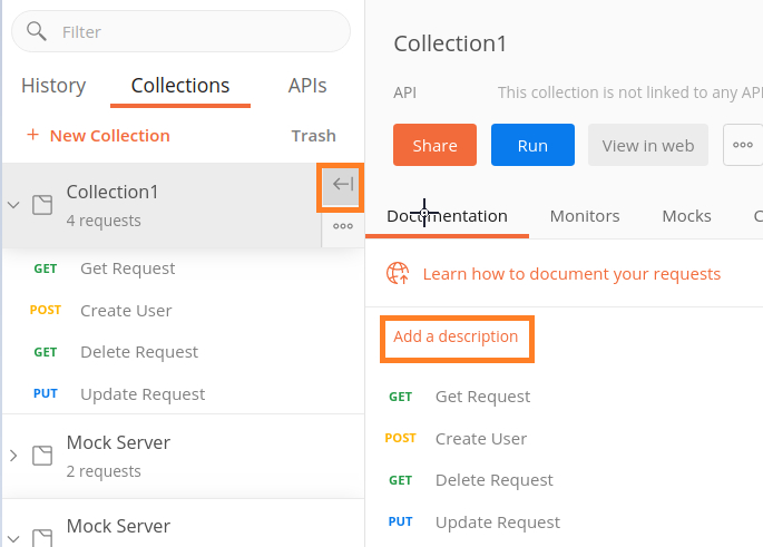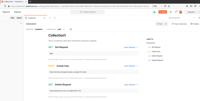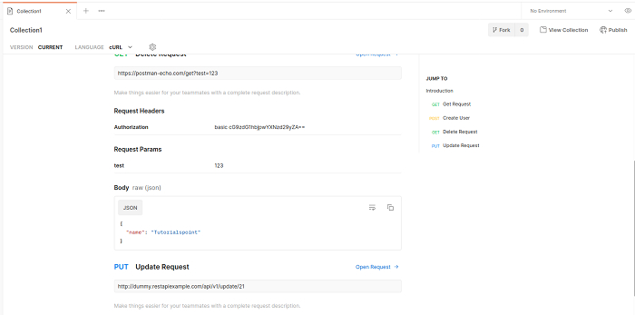 預設情況下,我們可以為 Postman 中使用的 API 生成文件。此文件可以私下或公開共享。Postman 在集合上建立和託管文件,這些文件可以透過瀏覽器即時同步。此外,此文件有助於在團隊和其他利益相關者之間共享公共 API。