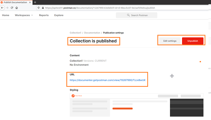 步驟 9 - 我們的集合將釋出成功訊息。我們還將獲得文件的 URL。此外,我們可以修改或刪除集合的釋出。