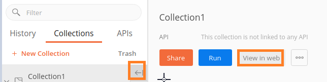 步驟 5 - 登入到 Postman 帳戶後,我們將在“執行”按鈕右側找到“在 Web 中檢視”。這將在點選側邊欄中集合名稱旁邊的箭頭時顯示。