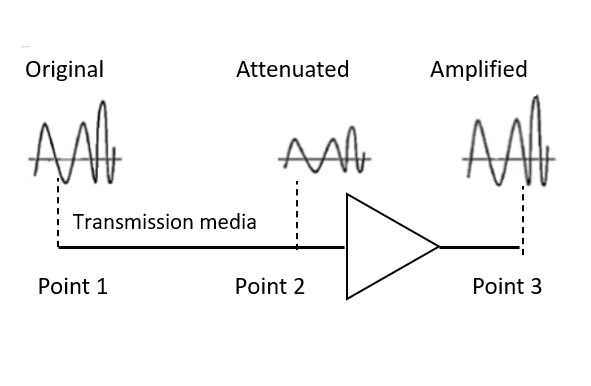 在上圖中可以清楚地看到,當訊號從點1傳輸到點2時,由於衰減失真,訊號在到達目的地之前會損失能量。