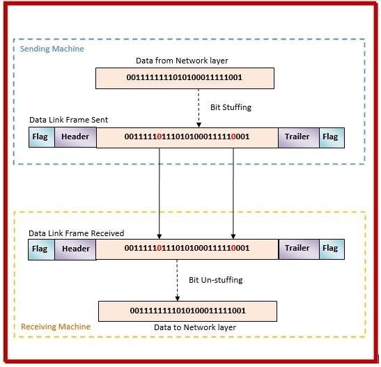 當接收器接收到訊息時,它會刪除每個五個 1 序列之後的填充 0。然後將未填充的訊息傳送到上層。