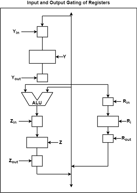 當輸入門控 Rin 設定為 1 時,資料將載入到暫存器匯流排 Ri 中,該匯流排可在公共總線上訪問。當 Rout 設定為 1 時,暫存器 Ri 的內容將放置在資料匯流排上。它被稱為輸入使能和輸出使能訊號。處理器內部發生的函式與時鐘脈衝同步。