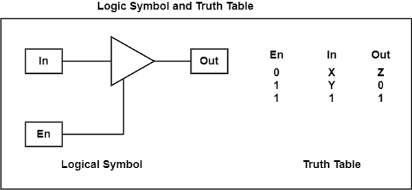 - 當提供的輸入為 0 時,門進入高阻抗狀態 Z,並且輸出被停用。