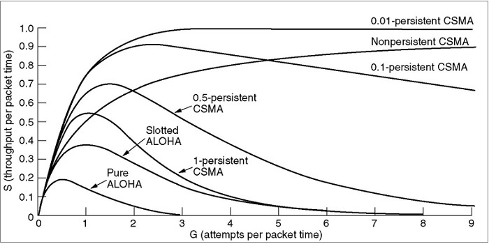 讓我們看看各種隨機訪問協議的通道利用率與負載的比較:-