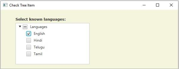 CheckBoxTreeItem<String> checkBox4 = new CheckBoxTreeItem<>("Tamil");
