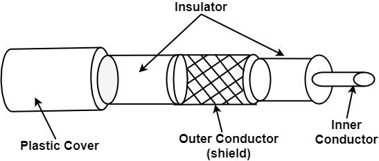 同軸電纜包括一根中央銅線,周圍包裹著 PVC絕緣層,在其上覆蓋著銅網套。同樣,金屬套管被一層厚厚的 PVC 材料製成的外部遮蔽層遮蔽,如圖所示。