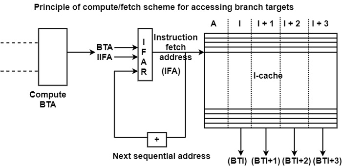 這種方案是訪問分支目標的常用方法。首先,分支目標地址 (BTA) 由流水線或專用加法器計算。因此,獲取匹配的分支目標指令 (BTI)。在當前處理器中,這定義了對 I 快取的訪問,而在沒有 I 快取的初始流水線處理器中,則訪問記憶體。