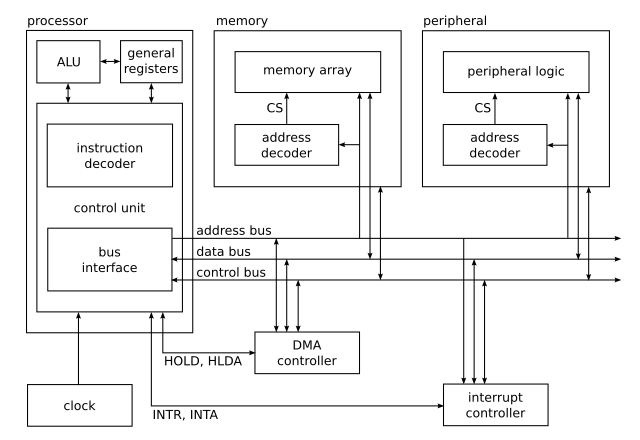 所有上述部分都透過系統匯流排連線,系統匯流排由地址匯流排、資料匯流排和控制匯流排組成。