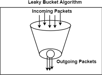 在這種演算法中,考慮一個容量為 b 位元組且底部有一個孔的桶。如果桶為空,則表示有 b 位元組可用作儲存。大小小於 b 位元組的資料包到達桶並將其轉發。如果資料包的大小增加超過 b 位元組,則它將被丟棄或排隊。還認為桶以每秒 r 位元組的恆定速率透過底部的孔洩漏。