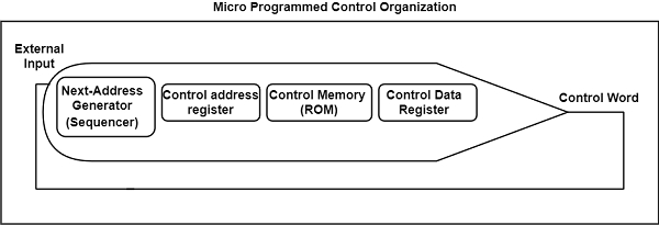 在這裡,控制被假定為只讀儲存器 (ROM),所有控制資訊都永久儲存在其中。ROM 提供微指令的地址。另一個暫存器,即控制資料暫存器,儲存從儲存器讀取的微指令。它包含一個控制字,該控制字為資料處理器儲存一個或多個微操作。