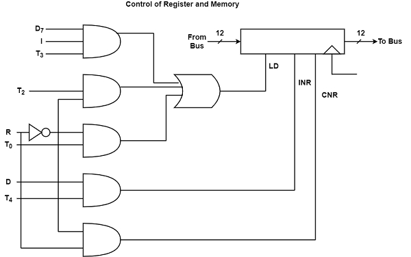 其中LD(AR)是AR的載入輸入,CLR(AR)是AR的清零輸入,INR(AR)是AR的增量輸入。與AR相關的控制門邏輯顯示在圖中。