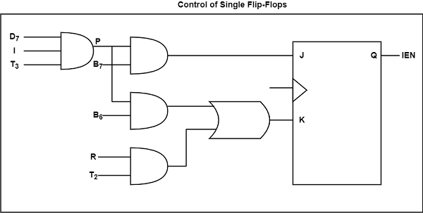 觸發器電路可以持續地保持在一個二進位制狀態(只要電路通電),直到被輸入訊號觸發切換狀態。七個觸發器的控制門可以類似地確定。例如,表格顯示IEN可能會因為ION和IOF兩條指令而發生變化。