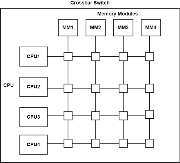 每個交叉點中微小的正方形是一個開關,決定從處理器到記憶體模組的方向。每個交換點都必須控制邏輯以建立處理器與記憶體之間的傳輸方向。
