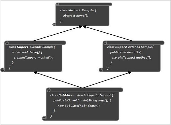 }然後,根據繼承的基本規則,`demo()` 方法的副本應該在子類物件中建立,這使得子類擁有兩個具有相同原型(名稱和引數)的方法。然後,如果您使用子類物件呼叫 `demo()` 方法,編譯器將面臨一個不明確的情況,不知道呼叫哪個方法。這個問題在 Java 中被稱為菱形問題。