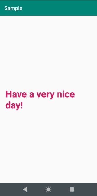 <?xml version="1.0" encoding="utf-8"?> <LinearLayout xmlns:android="http://schemas.android.com/apk/res/android" xmlns:tools="http://schemas.android.com/tools" android:layout_width="match_parent" android:layout_height="match_parent" tools:context=".MainActivity"> <TextView android:layout_width="match_parent" android:layout_height="wrap_content" android:text="Have a very nice day!" android:textSize="35dp" android:textStyle="bold" android:textColor="@color/colorAccent" android:layout_centerInParent="true" android:padding="20sp" android:layout_gravity="center_vertical" /> </LinearLayout>