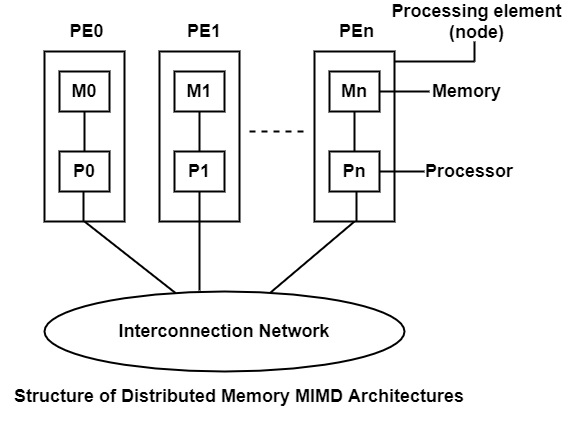 分散式記憶體MIMD架構被稱為多計算機。它可以複製處理器/記憶體對,並透過互連網路將它們連線起來。處理器/記憶體對被稱為處理單元(PE),PE彼此之間基本上是獨立工作的。