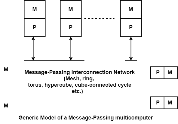 訊息傳遞網路支援節點之間的點對點靜態連線。所有本地記憶體都是私有的,只能由本地處理器訪問。對於這種方法,傳統的Muticomputer被稱為無遠端記憶體訪問(NORMA)機器。