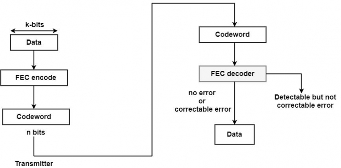每個k位元的資料塊都新增冗餘位,構成n位元的碼字(n > k)。傳送端使用前向糾錯編碼器。然後,傳輸碼字。訊號被解調以生成與初始碼字等效的位元串,其中包含接收端的錯誤。