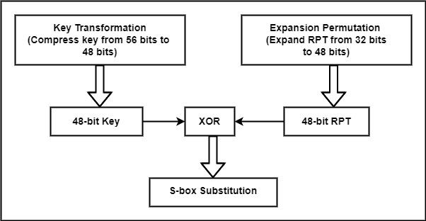 首先可以看出,金鑰轉換階段將 56 位金鑰壓縮為 48 位。因此,擴充套件置換過程將 32 位 RPT(右明文)擴充套件到 48 位。現在,48 位金鑰與 48 位 RPT 進行異或運算,並將結果輸出傳遞到下一步,即圖中顯示的 S 盒替換。