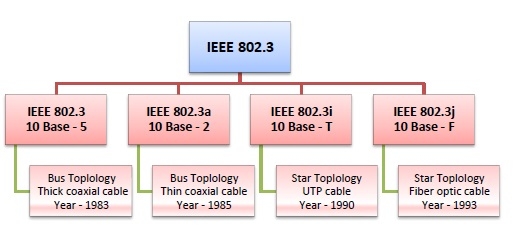 IEEE 802.3:這是最初為10BASE-5制定的標準。它使用粗同軸電纜,可以透過鑽入電纜核心進行連線。其中,10表示最大吞吐量,即10 Mbps;BASE表示使用基帶傳輸;5表示最大段長為500米。