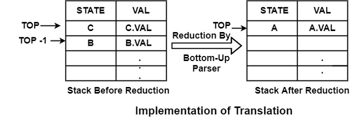 **歸約後** - 當 BC 歸約為 A 時,B 和 C 及其對應的值 B.VAL 和 C.VAL 將被彈出,並將帶有 A.VAL 的 A 壓入棧中。因此,歸約後,棧在其棧頂將包含變數 A,而 VAL[TOP] 現在將包含 A.VAL。