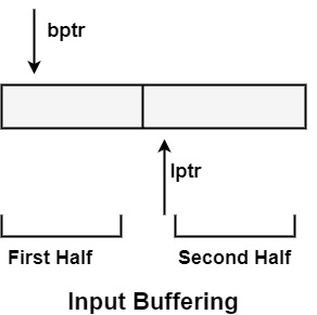 緩衝區可以分成兩半。如果前瞻指標向第一半的中間移動,則第二半將填充要讀取的新字元。如果前瞻指標移動到第二半緩衝區的右端,則第一半將填充新字元,然後繼續此過程。