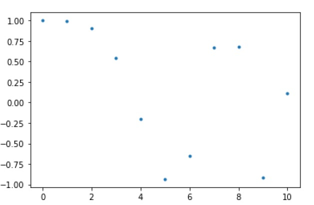 [ 0. 1. 2. 3. 4. 5. 6. 7. 8. 9. 10.] [ 1. 0.99383351 0.90284967 0.54030231 -0.20550672 -0.93454613 -0.65364362 0.6683999 0.67640492 -0.91113026 0.11527995]