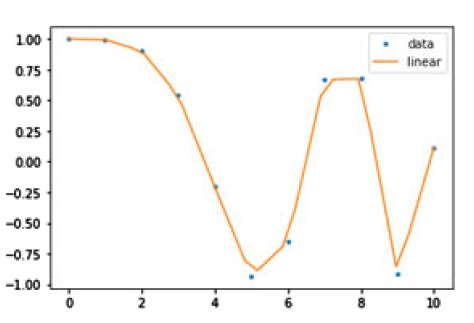 Anew = np.linspace(0, 10, num=30, endpoint=True) plt.plot(A, B, '.', Anew, function_interpolate(Anew), '-') plt.legend(['data', 'linear'], loc = 'best') plt.show()