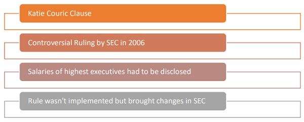 “凱蒂·庫裡克條款”是由媒體創造的一個術語,它指的是美國證券交易委員會 (SEC) 在 2006 年考慮採用的一個有爭議的決定。該規定最初於 2006 年提出,最終被否決。該裁決被稱為《高管薪酬及關聯方披露條款》。