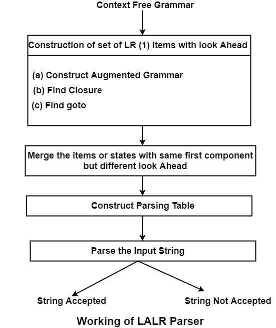 LALR 解析器是前瞻 LR 解析器。它的功能介於 SLR 和 CLR 解析器之間。它是 CLR 解析器的壓縮版本,因此由此獲得的表格將比 CLR 解析表更小。