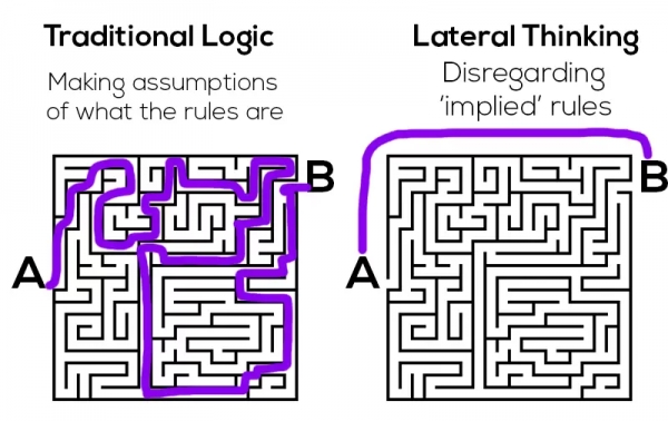 一種直接透過訓練方法的方式,可以讓你到達一個單一目的地,就像使用給定資料逐步計算一樣,這被稱為“**縱向思維**”。橫向思維激發前所未有的新想法,改變了你選擇看待解決方案的參考框架。這種不同的解決問題的方法被稱為“**橫向思維**”。