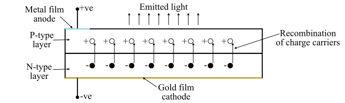 當在正向偏置下向 LED 燈施加直流電源時,多數載流子開始漂移,即電子向正極漂移,空穴向電源的負極漂移。在 PN 結處,電子和空穴發生複合,由於這些載流子的複合,能量以熱或光的形式釋放。